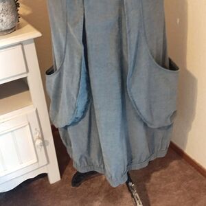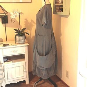 Nook denim with a classic light blue/ gray hue. Short sleeves. Side zip. Dropped waist. Pockets at high waist, big baggy pockets on skirt. The hem is gathered. Variations in color on fabric are natural. Size 6 measures 37 at chest, 34 at waist, 46 at hips, full skirt. 52 at bottom hem. 45 long from shoulder to hem. Different and comfortable, a perfect combination.
