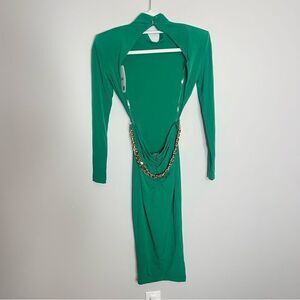 Stunning long sleeve midi with an ultra high neckline and strong shoulder. Features cut outs at the side waist and a stunning low back adorned with a luxe gold chain detail. Features shoulder pads & ruched zip closure with gold Nookie puller at back.