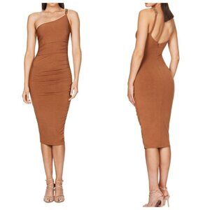 Nookie Alyssa Chain Midi Dress Women's Size S Tan One Shoulder Sleeve Jersey