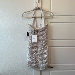 Sweet lace mini with low plunge neckline and delicate ruching across the body. Invisible zip back, fully lined.