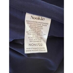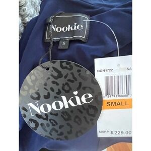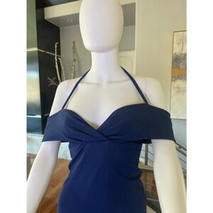 This NWT Nookie Off Shoulder Midi Dress in blue features a front tuck detail and halter straps, Nookie's signature scuba crepe fabric, and a hidden back zipper closure.