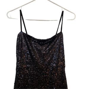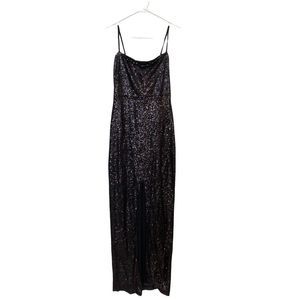Elegant black maxi dress. Features shimmering sequins. Spaghetti straps and side slit. Perfect for evening events.