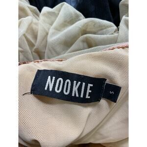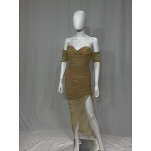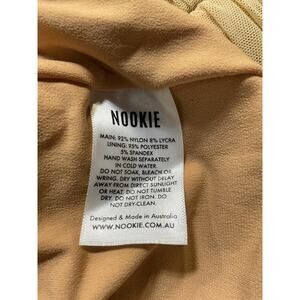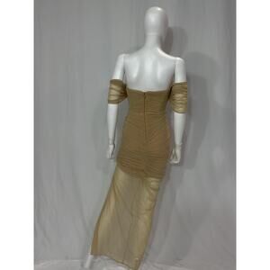 Nookie 'Dita' Tan Mesh Gown Size S: partially lined, hidden back zipper closure, non-slip silicone grip lining, boned bodice, ruched mesh fabric overlay.