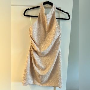 Super cute nude beaded sequin mini dress that features a high neckline and low back
