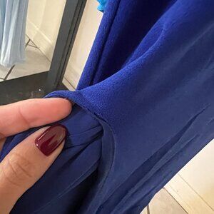 Worn once for a wedding. Mint condition. I'm 5'2 and it's hemmed to wear with 3' heels. One minor flaw on slit, can be easily repaired, photo attached. Stretchy and thick fabric. TTS.