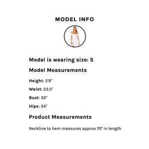 Model Measurements: Height 5'9", Waist 23.5", Bust 32", Hips 34"