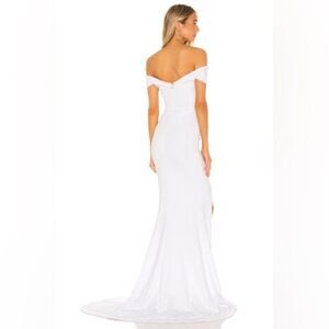 Gorgeous off the shoulder fishtail hem with beautiful train and slit gown .