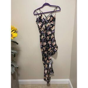 Evoke a sunshine state of mind in this stunning satin maxi. Designed in a summery floral with a loop front bra, double straps & feminine frill hem. Zip closure at centre back.