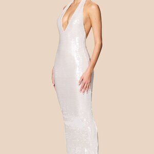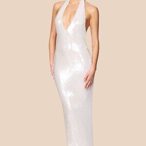Classic Nookie plunge halter gown in a white high-shine sequin. Featuring an elegant low back, buttons at back neck and invisible zip at back waist. Fully lined.