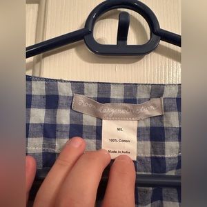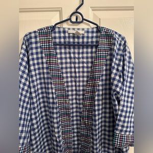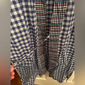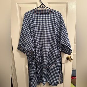 Blue/white checkered robe with multi-colored checker pattern on trim on sleeves and robe opening/tie. Super light weight cotton material. The sleeves hit about right at the elbow. There are pockets!!! There is a tie on the inside of the robe as well as the wider tie that goes around the waist. Open to offers