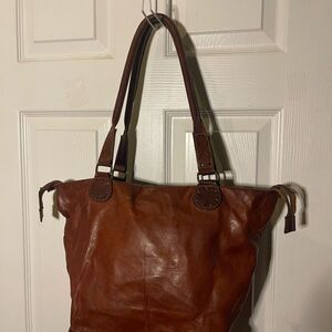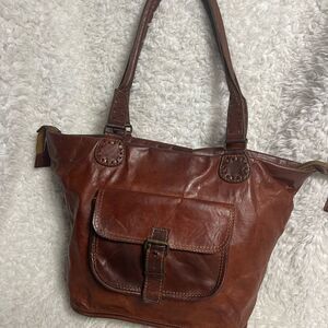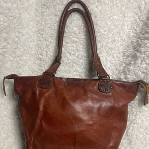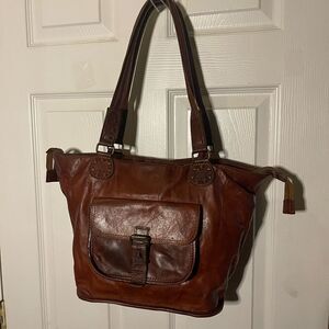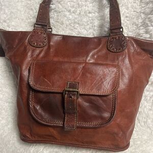 Leather shoulder bag rustic hardware.front pocket buckle closure. Top zipper the inside lining has two side zipper. Pre owned in good used condition signs. Signs of wear on the leather no tear the inside lining has small transfer marks but clean. See all pictures any questions please message. Z1