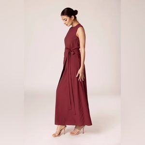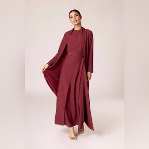 This versatile set features subtle textured fabric, a sleeveless maxi dress, adjustable wrap overlay skirt and open abaya duster jacket.