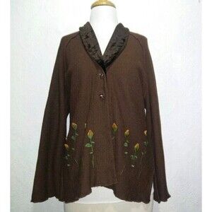 Unique textured knit cardigan in a size S from Nooshin.Size is a marked S but has that Boutiquey oversized quality to it. This has 2 lovely art glass buttons for closure and a silky soft velvet shawl style collar. Rich chocolate brown color body and slightly darker brown velvet trim. Raglan sleeves. Folded golden yellow velvet ribbon forms rosebud design at the front with deep green stitching stems. Exposed overlock seams and lettuced edges.Not super heavy. Rayon/Cotton/Linen blend. Label says to dry clean.