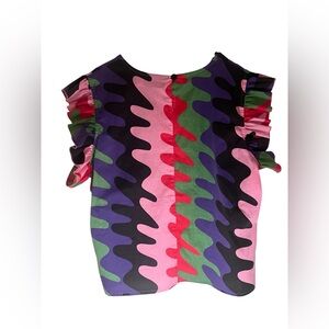 Really fun ruffle top in the static print. Ready for a new home. Below is ruffle top listing from nooworks website, has measurements. In used condition, a small white spot that looks like color fading by the neck (there is a picture) and som white fading near right arm (included a picture). She is still in good condition but not in near new condition.