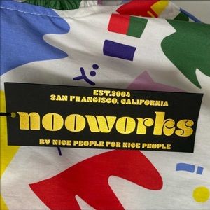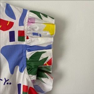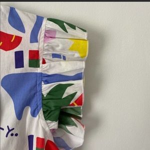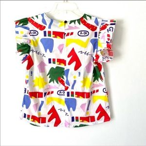 Bright abstract print blouse by Nooworks. Ruffle short sleeves. Vibrant multicolor pattern. Lightweight woven fabric. Playful, modern style.