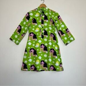 60s, retro inspired. Tunic, A-line silhouette. Relaxed fit. Mini length. Wide, 3/4 sleeves. Mock neckline. Side pockets. Front button closure (placket) at bodice. Unlined, very slight sheerness. Lightweight, thin fabric with some stretch. Hand wash cold. Made in USA.