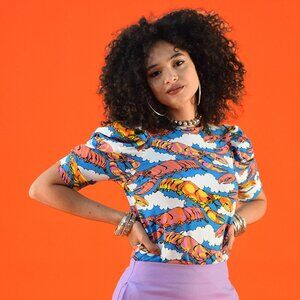 Go fancy and free in this easy to wear jersey top with feminine detailing. Made from our soft stretchy jersey, the body of this top is fitted and perfect for tucking into higher waisted bottoms. It features a nice curved hip length hemline so it looks cute worn untucked too, and with perfect gathers at the shoulders that bring stylish volume to the airy short sleeves, your look will come together in a snap!