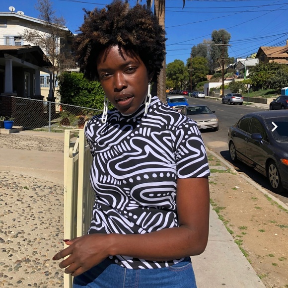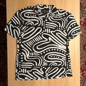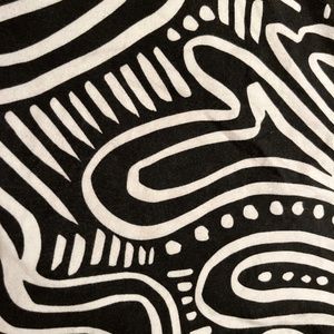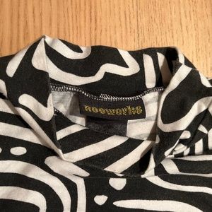 Mockneck top by Nooworks! Sold out online! black and white squiggles add a fun twist to any outfit. flattering cut, especially tucked in. Stretch cotton fabric means it fits comfortably with ease of movement. There is some very slight fading in the fabric and on the tag due to washing, (pictured) but it’s hardly noticeable if you’re not looking closely for it.