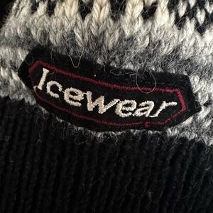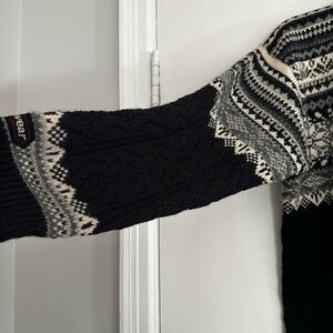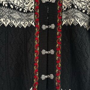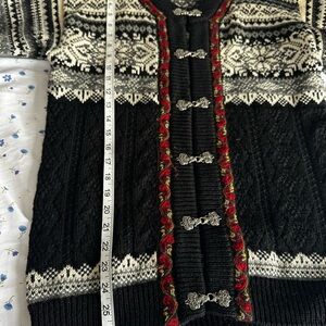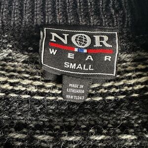 Nor Wear 100% Wool. Small Casual Women's Wool Cardigan Nordic Ice Wear Sweater. black, white, and grey Nor Wear wool Fair Isle cardigan with metal clasps down the front. Red paisley trim. Snowflake geometric knit pattern. Black cable knit center. Great used condition. Not stains. There is a very small hole in the right sleeve cuff. Noted in the photos. Please see pictures for measurements.