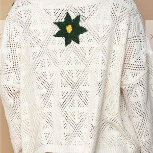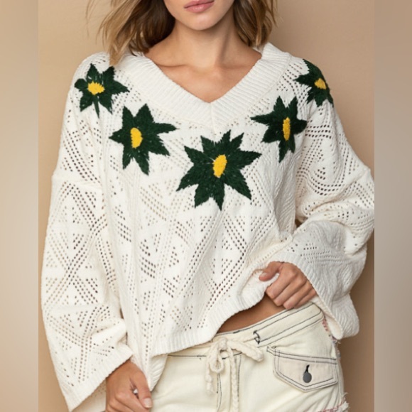 Stay cozy and stylish with this white floral knit sweater. Featuring green and yellow floral accents, it's perfect for any casual outing.