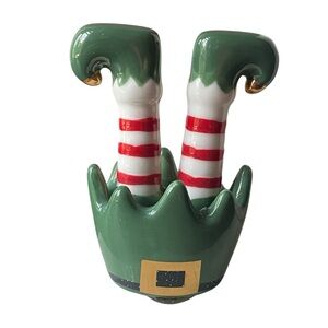 This image shows a Nora Fleming "Jingle Toes" mini, which features upside-down elf feet in a green base