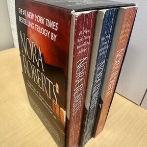 The product is a trilogy of novels by Nora Roberts titled "Blood Brothers," "The Hollow," and "The Pagan Stone." Set in the United States, the series is a captivating narrative in English and in paperback. Written by Nora Roberts, the novels delve into the world of fiction and are sure to captivate readers with their storytelling and engaging characters. Perfect for fans of mystery and romance, this trilogy is a must-read for those interested in the world of Nora Roberts. The books are is good condition but the spine of the books shows wear.