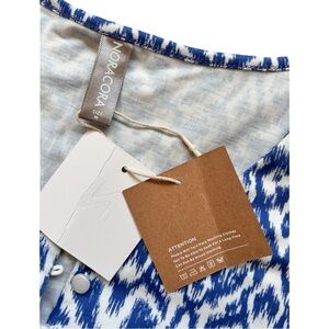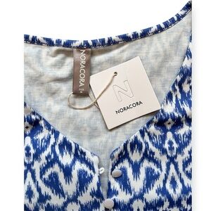 NoraCora white and blue geometric shirt blouse. Quarter button down, cutout detailing on the sleeves. Brand new with tags NWT.