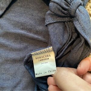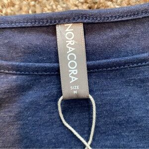 Beautiful new with tags Noracora blue top with white knitted/lace sleeves. Side wrap front. Soft material. Size medium. See pics for approximate measurements.