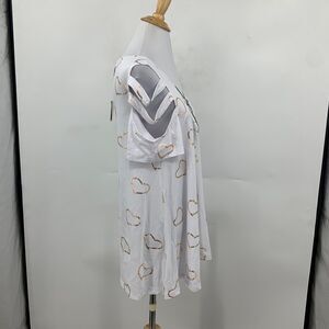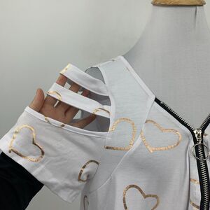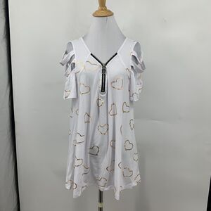 Noracora Top Womens L White Heart Cutout Cold Shoulder Zip V Neck Short Sleeves
