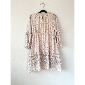 Crafted in chiffon, featuring a cinched waist and ruffle detailing throughout. This dress is fully lined and finished with a teardrop two button closure at the back.