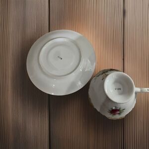 This vintage Norcrest coffee cup and saucer set is a must-have for any tea or coffee lover. The white bone china is adorned with a beautiful floral pattern in white and gold, with a political theme of "I'm Democrat". The set includes two pieces, a cup and a saucer, both of which are printed with the backstamp.