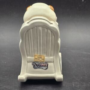 this vintage Norcrest ceramic piggie bank features a female teddy bear in a rocking chair and reads "Retirement fund"