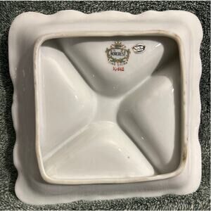This lovely vintage Norcrest serving dish from Japan is a delightful addition to any collection. Adorned with beautiful rose bud flowers and gold trim, this porcelain candy dish features four compartments and a handle for easy serving. The square shape and glossy finish give it a timeless look, perfect for any occasion.