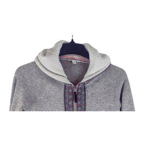 American Eagle Outfitters Nordic cardigan/hoodie with faux fleece lined hood. Gray with Nordic trim accent along zipper and pockets. Very good condition, missing cord pull for hoodie, no stains or snags.