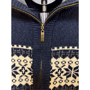 Cold-weather classic with serious après-ski energy. This vintage Y2K Nordic zip-up sweater features a rich navy base with traditional cream Fair Isle patterning across the chest and sleeves. Full front zip with a structured mock neck, ribbed cuffs and hem for warmth and fit. A perfect piece for layering — cozy, timeless, and effortlessly alpine-coded.