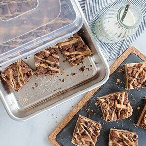Commercial-quality Naturals® Bakeware cake pan. Made of pure aluminum, these premium pans will never rust or warp, and they produce evenly browned baked goods every time. Comes with a lid for added functionality by sealing in freshness and making transport simple. Lid snaps around edges to keep contents fresh. When pressed down properly on the ends the lid will snap over the rim of the pan to fit. The lid lightly clicks into place, it is more of a loose fit on all pans.
