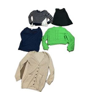 This designer lot of 5 tops and sweaters includes brands like Anthropologie, Nordstrom, ASOS, Ella Moss, and Clu. The pieces come in a variety of colors and sizes, perfect for any woman's wardrobe. Whether you're looking for a statement piece or something more casual, this lot has something for everyone. Don't miss out on the opportunity to add these stylish and unique items to your collection.