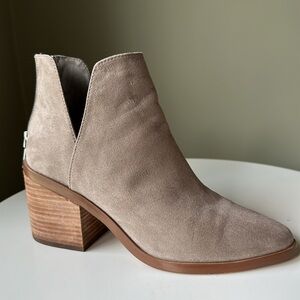 Description: These are pointed-toe ankle boots featuring a block heel, notched sides, and a back-zip closure. They are made with a faux suede fabric upper.