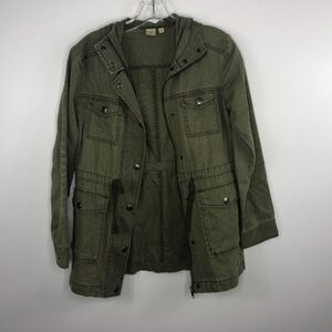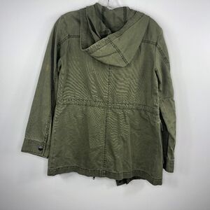 Pockets and hood make this the perfect field jacket for your outdoor adventures. Drawstring waist. Longer length. Size xs. Gently used condition. Measurements are approximate and Taken When Garment Laid Flat. Armpit to Armpit: 18" Length: 27".