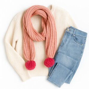 Style: Chunky knit, pompom trim, muffler scarf