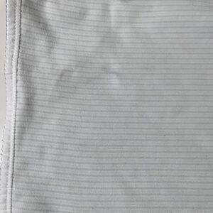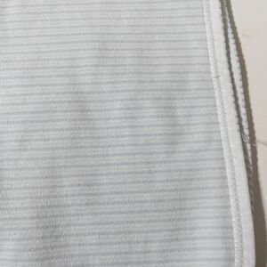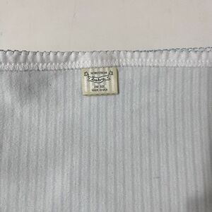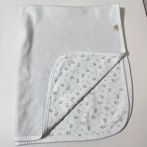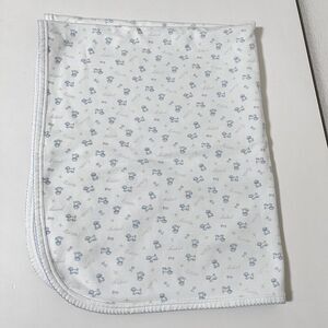 Nordstrom Baby Blue Little Puppy Dog Striped Boys Baby Blanket Receiving Blanket Lovey Lovie Blankie. I believe that this is a vintage piece, but am not certain? One side of the blanket is puppy dogs print with bones and "little" and "puppy" written allover, the other side is blue striped. There is about a 4.25 inch portion of the trim where the blue decorative stitching has come undone. There is a small hole on the striped side of the blanket, this is a double layer blanket, so does not go through both sides, but is on the striped side. There are also multiple stains on both sides of the blanket, mostly on the striped side, but on both sides. Normal wash wear and fade to the fabric as well. Please see the pictures. Still has a ton of life left, but is far from perfect.
