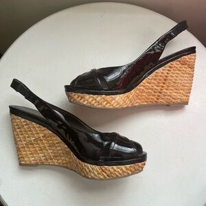 Nordstrom Black Patent Leather Slingback Basket Weave Platform Wedge Sandals 9