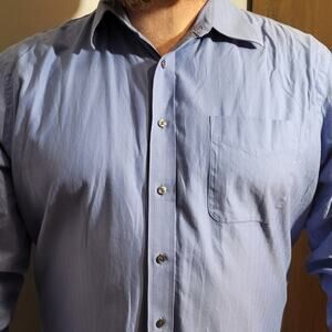 Classic blue dress shirt in a subtle pale-blue jacquard stripe, tailored for a polished, modern fit. 100% cotton, sustainably sourced single-fiber fabrication. Abalone buttons, chest pocket, crisp collar, and Fall/Holiday 2010 construction quality. Preppy, executive, minimalist—built for reliability and everyday refinement.