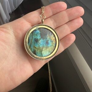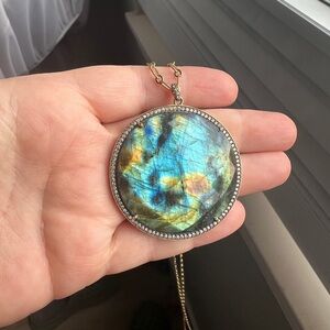 This is a beautiful slice of labradorite. It is set beautifully, surrounded by CZ’s that sparkle. If you are familiar with labradorite, it can have amazing pops of color when viewed on a certain angle. This one is stunning. There is a little tarnishing around the setting, but not visible when wearing. The chain is about 24 inchs, but adjustable (as you can put the clip in any one of the holes. The clip has turned silver color, but the chain is gold plated as you can see in the picture. Bought this from Nordstrom from a high end designer, but cannot remember which one. This is a statement piece!