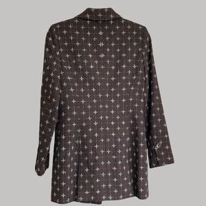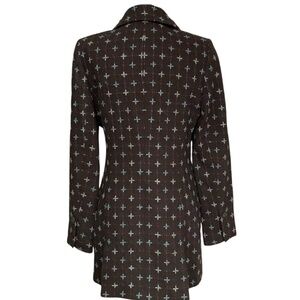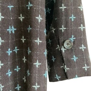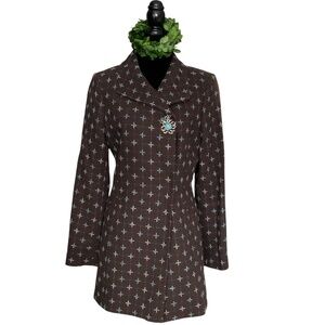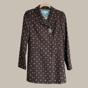 Nordstrom Caslon vintage style grayish brown wool blend coat jacket long blazer with blue pattern detail and large snap closures. Size small. Top closure with snap had blue and clear crystal brooch detail that accents vintage look. Fully lined with contrasting blue satin fabric. 2 functional front slit pockets. 1 internal hidden slit pocket. 1 button detail on cuffs. Slight shoulder padding. Medium weight piece that works as a suit jacket with solid color pants or an elevated topper with jeans.