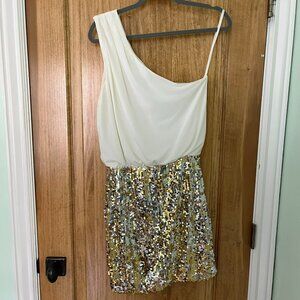 The dress features a white draped one-shoulder top with a bondage style gold sequin mini skirt.