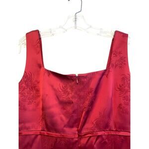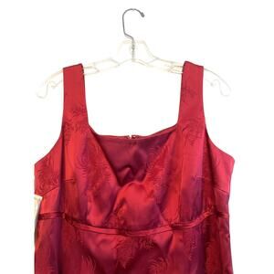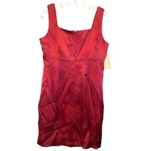 New with tags Classiques Entier sleeveless mini dress in deep red. Beautiful and classy sheath pencil style short dress in smooth satin fabric with sheen. Subtle floral and botanical monochrome textured pattern all over. Square neck, wide straps, back slit, back zipper closure. Perfect for holiday, formal, special events, evenings out, club... or layer under a jacket or blazer for office or business. Lined. In good condition, seam above back slit has some small loose threads and a small part of the seam has some apart and another small part is loose. No holes so it can be repaired if desired. MSRP $138.