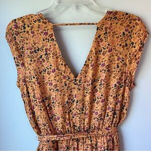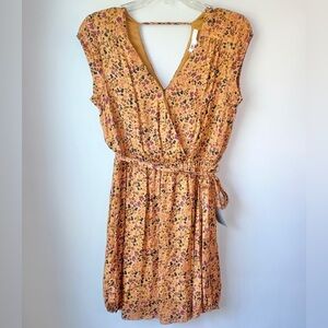 Daniel Rain caramel-colored Nordstrom brand DR2 cap sleeve mini dress features rose and black pattern, deep v-back detail and wrap v-neck in the front with a small button that can be worn open or closed. Cute buttons cinch up the sides of the hem. Waist tie included.