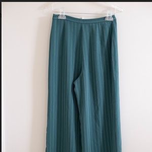 These are the most badass pants! A really unique shade of dark green/ turquoise wide leg trousers with white pinstripes. Perfect condition - just a little too small on me now! Would go great with a simple white tee and a blazer or leather jacket.