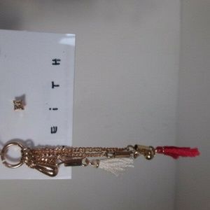 Bright tassels dangle from one of a trio of mismatched earrings that are fun to mix up for different looks.